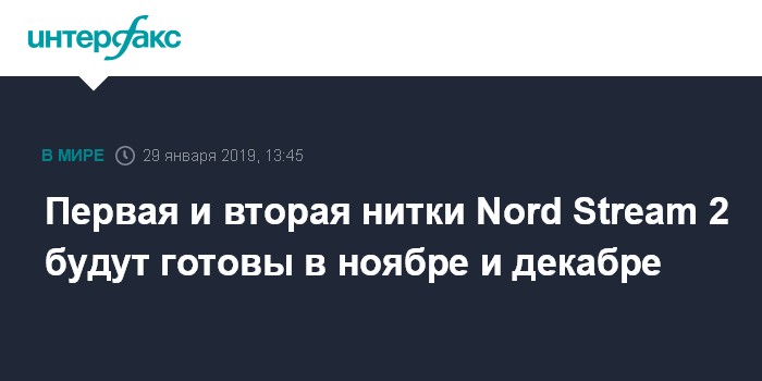 Москва. 29 января. INTERFAX.RU - Первая нитка газопровода Nord Stream 2 ("Северный поток 2") будет готова в ноябре, вторая - в декабре 2019 года, сообщил финансовый директор проектной компании Nord Stream 2 AG Пол Коркоран на Европейской газовой конференции в Вене.