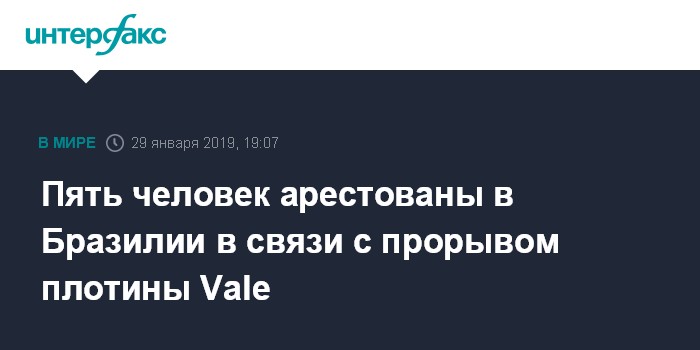 Москва. 29 января. INTERFAX.RU - Полиция Бразилии арестовала трех сотрудников и двух подрядчиков компании Vale SA в Сан-Паулу и Белу-Оризонти в связи с прорывом плотины на руднике Corrego do Feijao в штате Минас-Жерайс, в результате которого погибло не менее 65 человек и почти 300 числятся пропавшими.