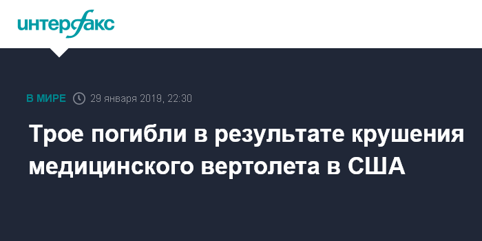 Москва. 29 января. INTERFAX.RU - Трое членов экипажа погибли в результате крушения вертолета службы скорой медицинской помощи в штате Огайо, сообщил телеканал ABC во вторник.