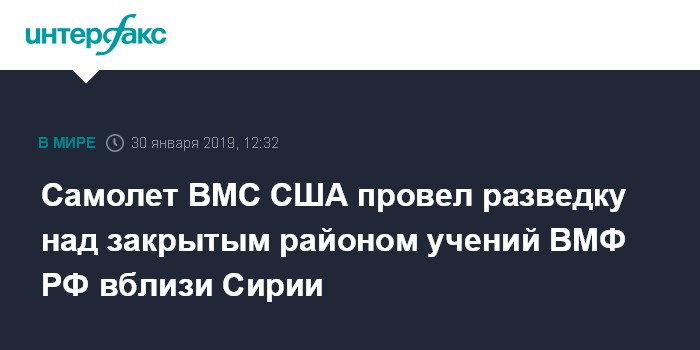 Москва. 30 января. INTERFAX.RU - Патрульный противолодочный самолет ВМС США P-8A Poseidon в среду совершил длительный разведывательный полет над закрытым морским районом вблизи Сирии, где должны проходить учебные ракетные стрельбы с кораблей ВМФ России, следует из мониторинговых данных западных авиационных ресурсов.