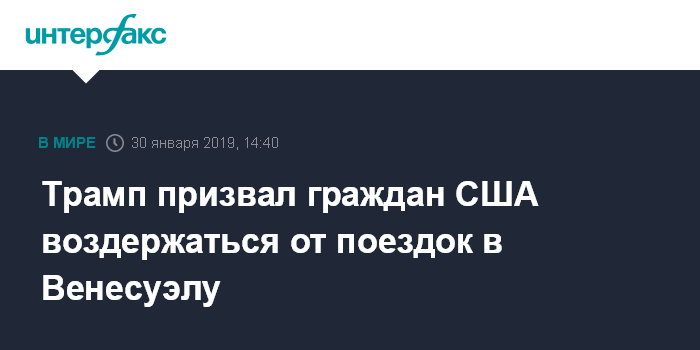 Москва. 30 января. INTERFAX.RU - Президент США Дональд Трампа рекомендовал американским гражданам воздержаться от поездок в Венесуэлу из-за ожидающихся протестов.