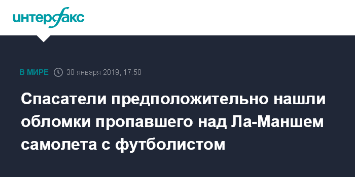 Москва. 30 января. INTERFAX.RU - Спасатели предполагают, что им удалось обнаружить обломки потерпевшего крушение самолета, на борту которого находился аргентинский футболист Эмилиано Сала, сообщает в среду газета The Independent.