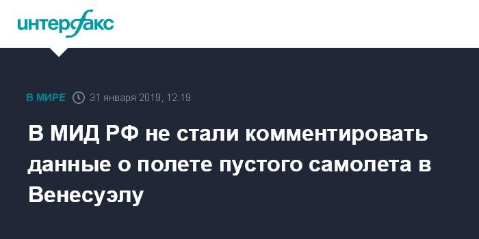 Москва. 31 января. INTERFAX.RU - МИД РФ не располагает информацией о якобы направлении пустого самолета из России в Венесуэлу, заявила официальный представитель МИД РФ Мария Захарова.