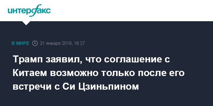 Москва. 31 января. INTERFAX.RU - Президент США Дональд Трамп заявил, что Вашингтон и Пекин не смогут окончательно урегулировать торговые разногласия до того момента, пока он не проведет встречу с председателем КНР Си Цзиньпином.