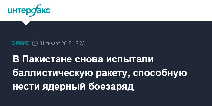 Москва. 31 января. INTERFAX.RU - Вооруженные силы Пакистана в четверг провели очередной успешный запуск тактической ракеты "Наср" класса "поверхность-поверхность", которая способна нести ядерный боезаряд, сообщила пакистанская межведомственная служба по связям с общественностью (ISPR).