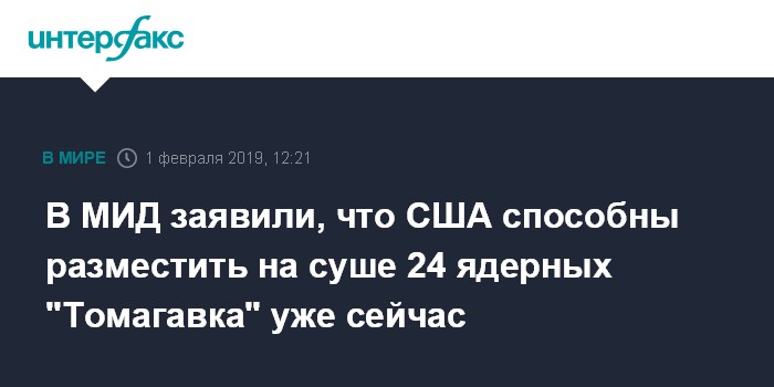 Москва. 1 февраля. INTERFAX.RU - Российская сторона не может исключать, что уже сейчас на суше могут появиться 24 американских крылатых ракет "Томагавк" в ядерном оснащении, заявил замглавы МИД РФ Сергей Рябков.