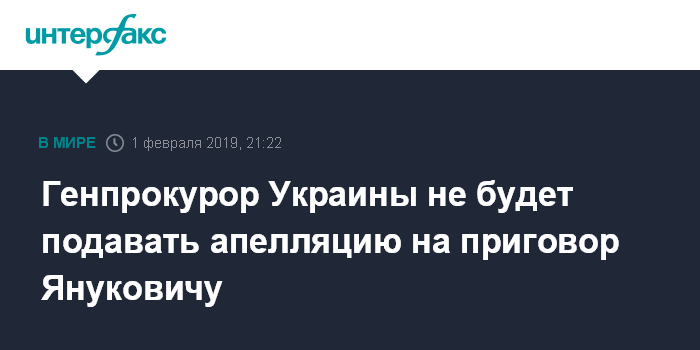 Москва. 1 февраля. INTERFAX.RU - Апелляция на приговор экс-президенту Украины Виктору Януковичу по обвинению в государственной измене подаваться не будет, необходимо сосредоточиться на доказательстве его причастности к другим преступлениям, заявил генеральный прокурор Украины Юрий Луценко.