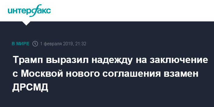 Москва. 1 февраля. INTERFAX.RU - Президент США Дональд Трамп в пятницу выразил надежду на то, что ему удастся заключить с Россией новое соглашение взамен Договора о ликвидации ракет средней и меньшей дальности (ДРСМД).