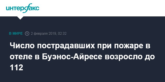 Москва. 2 февраля. INTERFAX.RU - Число пострадавших в результате пожара в гостинице в центре Буэнос-Айреса выросло до 112, сообщил в субботу телеканал TN.