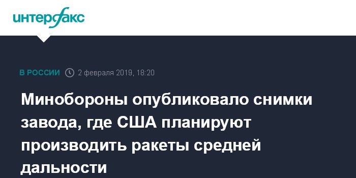 Москва. 2 февраля. INTERFAX.RU - Минобороны РФ опубликовало снимки ракетного завода в штате Аризоне, где по его утверждениям, США планируют начать производство ракет средней дальности. Снимки завода опубликованы на официальной странице министерства в твиттере.