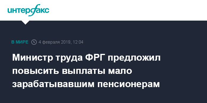 Москва. 4 февраля. INTERFAX.RU - Министр труда Германии Хубертус Хайль предложил повысить выплаты пенсионерам, которые получали низкую зарплату и при этом проработали не менее 35 лет, на 447 евро по сравнению с установленной в стране минимальной пенсией; об этом он заявил в интервью газете Bild am Sonntag