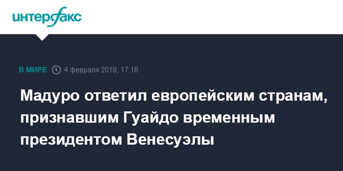 26 января Франция, ФРГ, Испания и Великобритания объявили, что признают Гуайдо временным главой государства, если в стране не будут объявлены выборы в течение ближайших восьми дней.