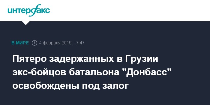 Москва. 4 февраля. INTERFAX.RU - Четверо украинцев и гражданин Грузии Лука Чхетия, воевавшие в украинском батальоне "Донбасс", в понедельник были освобождены под залог, сообщает грузинский Первый канал со ссылкой на Тбилисский городской суд.