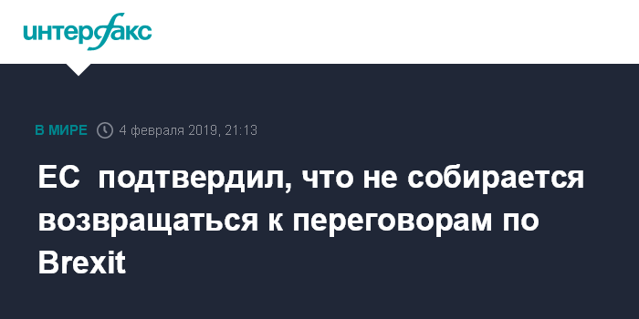 Москва. 4 февраля. INTERFAX.RU - Главный переговорщик ЕС по вопросу Brexit Мишель Барнье в понедельник заявил, что Брюссель не вернется к обсуждению условий сделки по Brexit.