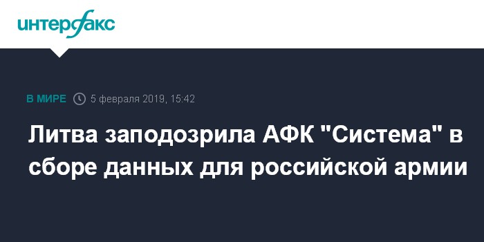 Москва. 5 февраля. INTERFAX.RU - Литовская компания, аффилированная с АФК "Система", возможно, использовалась для попыток сбора данных в интересах российской армии, заявила во вторник литовская разведка.