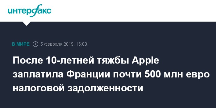 Москва. 5 февраля. INTERFAX.RU - Apple в конце декабря 2018 года достигла соглашения с налоговыми властями Франции об урегулировании претензий после 10 лет разбирательств, выплатив почти 500 млн евро налоговой задолженности, сообщает во вторник CNBC.