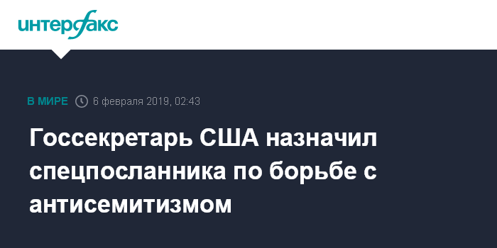 Москва. 6 февраля. INTERFAX.RU - Госсекретарь США Майк Помпео сообщил о назначении бывшего прокурора и военного Илана Кара спецпосланником по мониторингу и борьбе с антисемитизмом.