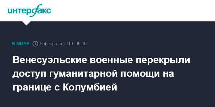 Москва. 6 февраля. INTERFAX.RU - Военнослужащие армии Венесуэлы заблокировали мост на границе с Колумбией, чтобы не допустить доставку в страну гуманитарной помощи. Об этом сообщают СМИ со ссылкой на представителей венесуэльской оппозиции.