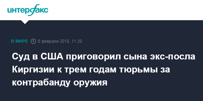 Москва. 6 февраля. INTERFAX.RU - Сын бывшего посла Киргизии в США Тенгиз Сыдыков осужден в США на три года лишения свободы по обвинениям в международной торговле оружием и контрабанде, сообщила в среду киргизская газета "Дело №".