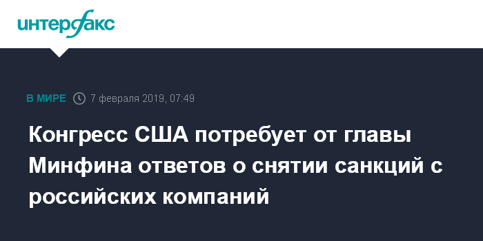 Ранее сообщалось, что председатели трех комитетов палаты представителей по разведке, финансовым услугам и иностранным делам демократы Максин Уотерс, Адам Шифф и Элиот Энгель запросили документы, касающиеся решения министерства финансов о снятии санкций с трех российских компаний "Русал", En+ и "Евросибэнерго", которые связаны с российским бизнесменом Олегом Дерипаской.