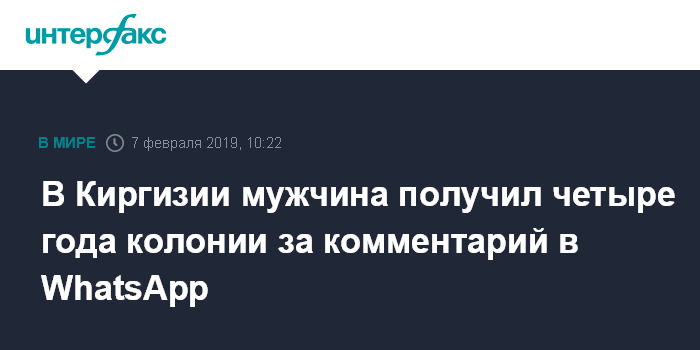 Москва. 7 февраля. INTERFAX.RU - Суд в Баткенской области на юге Киргизии приговорил 30-летнего местного жителя к четырем годам колонии общего режима по обвинению в разжигании межнациональной розни из-за публикации в мессенджере WhatsApp, сообщил "Интерфаксу" в четверг представитель областного суда Аскар Баймуратов