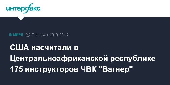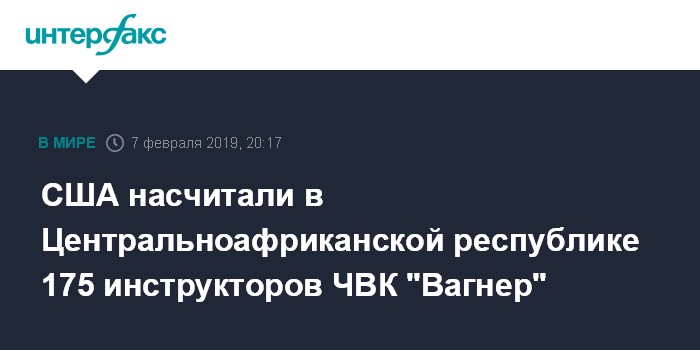 "Я хотел бы отметить, что у "группы Вагнера" в Центральноафриканской республике (ЦАР - ИФ) сейчас 175 инструкторов, и некоторые из них имеют доступ в кабинет президента (ЦАР)", - сказал Вальдхаузер на слушаниях в комитете Сената США по делам вооруженных сил.