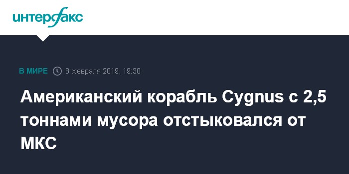 Москва. 8 февраля. INTERFAX.RU - Грузовой космический корабль "Сигнус" (Cygnus) после почти трехмесячного совместного полета в пятницу отстыковался от Международной космической станции (МКС), сообщило Национальное управление по аэронавтике и исследованию космического пространства США (НАСА).