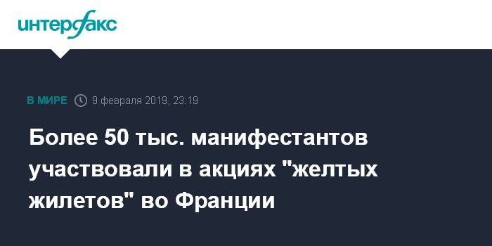 Москва. 9 февраля. INTERFAX.RU - По данным министерства внутренних дел Франции, в манифестациях движения "желтых жилетов" в субботу по стране в целом приняли участие около 51,4 тыс. человек, в том числе примерно 4 тыс. в Париже.