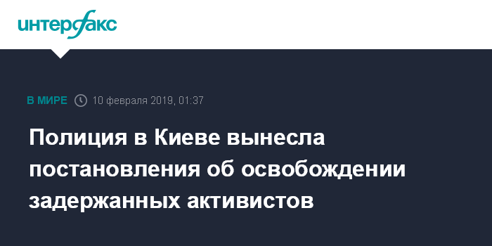Москва. 10 февраля. INTERFAX.RU - Полиция вынесла постановления об освобождении активистов, задержанных во время акции протеста, произошедшей под зданием управления полиции в Подольском районе Киева, сообщил адвокат задержанных Маси Найем.