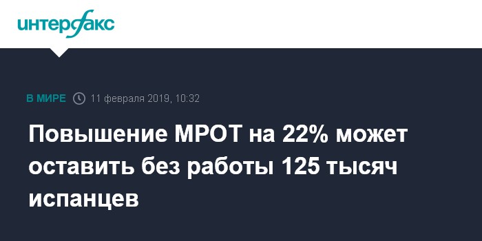 Москва. 11 февраля. INTERFAX.RU - Правительство Испании потребовало повысить минимальный размер оплаты труда в стране на 22% с января 2019 года, однако центральный банк опасается, что этот шаг уничтожит около 125 тыс. рабочих мест за текущий год, поскольку работодатели не выдержат увеличения расходов.