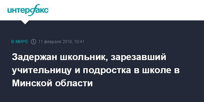 Москва. 11 февраля. INTERFAX.RU - В Белоруссии задержали подростка, который утром в понедельник зарезал педагога и ученика в школе города Столбцы в Минской области, сообщает белорусское МВД.