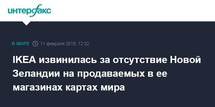 Москва. 11 февраля. INTERFAX.RU - Шведский ритейлер IKEA принес официальные извинения за отсутствие Новой Зеландии на карте мира, которая продается в его магазинах, передает "Би-би-си".