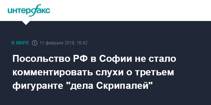 Москва. 11 февраля. INTERFAX.RU - В посольстве России в Софии воздержались от комментариев в связи с информацией о том, что предполагаемый третий фигурант "дела Скрипалей" Сергей Федотов посещал Болгарию и проходит подозреваемым по делу об отравлении в этой стране.