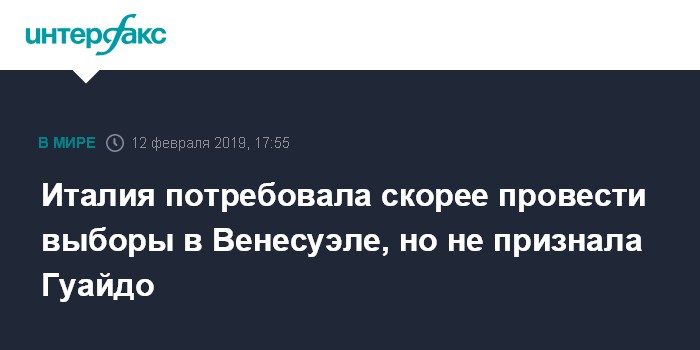 При этом министр не стал заявлять о том, что Италия признает лидера оппозиции Хуана Гуайдо временным президентом страны. По этому вопросу Рим не разделяет позицию многих других западных стран, уже признавших Гуайдо законным лидером Венесуэлы.