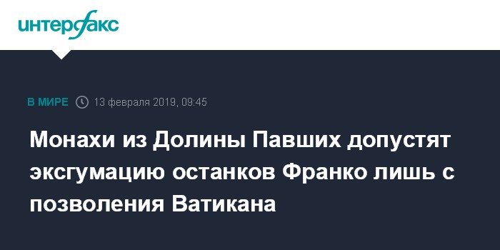 Накануне правительство Испании предупредило монахов-бенедектинцев, которые управляют мемориальным комплексом в Долине Павших, о возможности применения к ним мер юридического характера в случае, если они будут чинить препятствия эксгумации останков Франко.