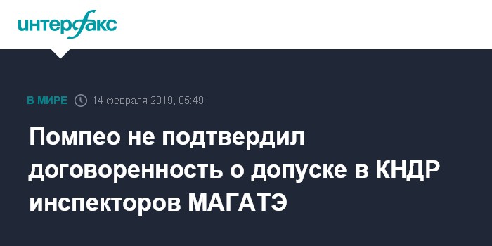Москва. 14 февраля. INTERFAX.RU - Госсекретарь США Майк Помпео отказался подтвердить, что на переговорах с представителями Северной Кореи, проходивших на экспертном уровне, была достигнута договоренность, что Пхеньян допустит инспекторов Международного агентства по атомной энергии (МАГАТЭ) для проверки его ядерных объектов.