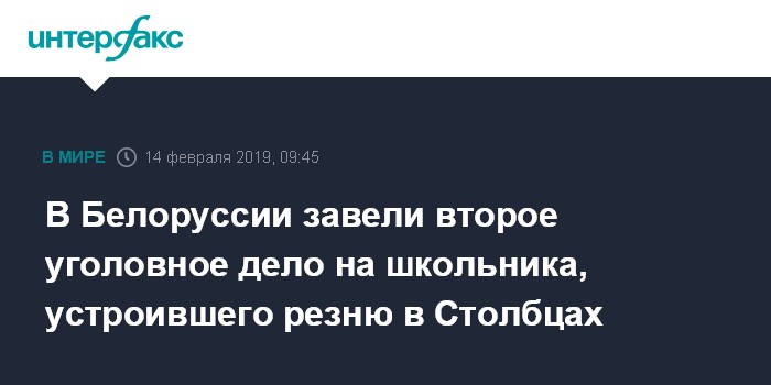 Москва. 14 февраля. INTERFAX.RU - Еще одно уголовное дело завели на подростка, устроившего резню в школе города Столбцы в Минской области, сообщает в четверг Следственный комитет Белоруссии.