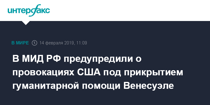 Москва. 14 февраля. INTERFAX.RU - США под прикрытием гуманитарного конвоя в Венесуэлу могут готовить провокацию с человеческими жертвами, заявила официальный представитель МИД РФ Мария Захарова.