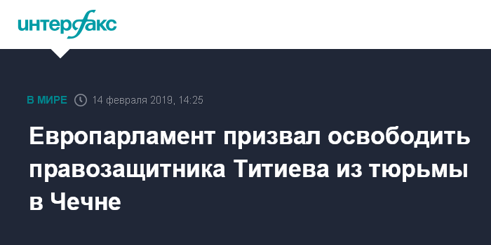 Москва. 14 февраля. INTERFAX.RU - Европейский парламент принял в четверг резолюцию о ситуации в Чечне, в которой, в частности, содержится призыв к немедленному освобождению директора отделения правозащитного центра "Мемориал" в Чечне Оюба Титиева, который был задержан 9 января.