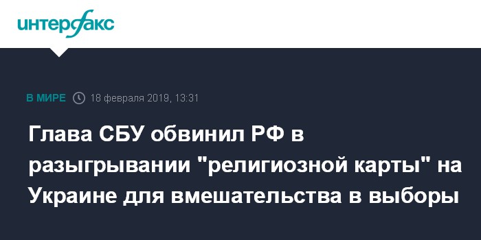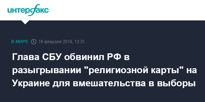 Москва. 18 февраля. INTERFAX.RU - Глава Службы безопасности Украины Василий Грицак утверждает, что Российская Федерация используют религиозную тематику для дестабилизации ситуации на Украине и вмешательства в избирательный процесс.