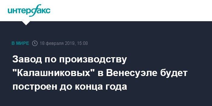 Москва. 18 февраля. INTERFAX.RU - Строительство завода по производству автоматов Калашникова в Венесуэле планируется завершить в 2019 году, сообщил генеральный директор "Ростеха" Сергей Чемезов.