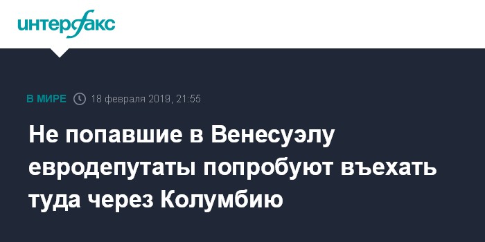 Москва. 18 февраля. INTERFAX.RU - Делегация Европарламента, состоящая из пяти депутатов, которых не допустили ранее в Венесуэлу, попытаются попасть в эту страну через Колумбию, откуда планируются поставки американской гуманитарной помощи.