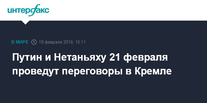 Москва. 19 февраля. INTERFAX.RU - 21 февраля состоятся переговоры президента РФ Владимира Путина с премьер-министром Израиля Биньямином Нетаньяху, который посетит Россию с рабочим визитом, сообщает пресс-служба Кремля.