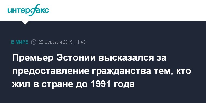 Москва. 20 февраля. INTERFAX.RU - Премьер-министр Эстонии, председатель крупнейшей правящей партии Центра Юри Ратас (Juri Ratas) высказался за предоставление гражданства лицам, проживавшим в стране до восстановления независимости государства.