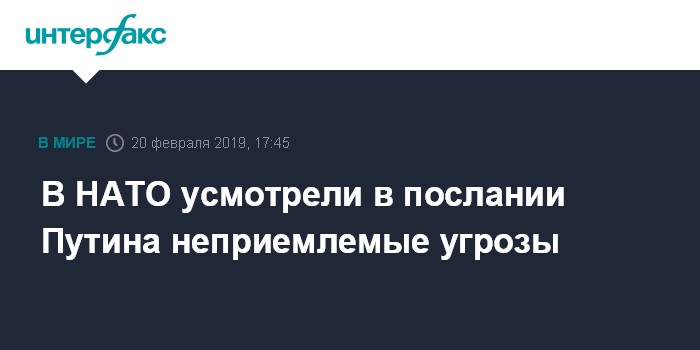 Москва. 20 февраля. INTERFAX.RU - В НАТО осведомлены о заявлениях президента РФ Владимира Путина в связи с ситуацией вокруг Договора о ликвидации ракет средней и меньшей дальности (ДРСМД) и считают угрозы Москвы неприемлемыми, заявил в среду заместитель представителя альянса Пирс Казалет.