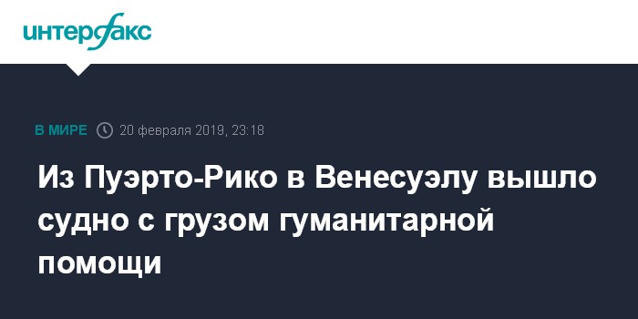 Москва. 20 февраля. INTERFAX.RU - Лидер венесуэльской оппозиции Хуан Гуайдо сообщил в среду о том, что в сторону Венесуэлы из Пуэрто-Рико вышло судно с грузом гуманитарной помощи.