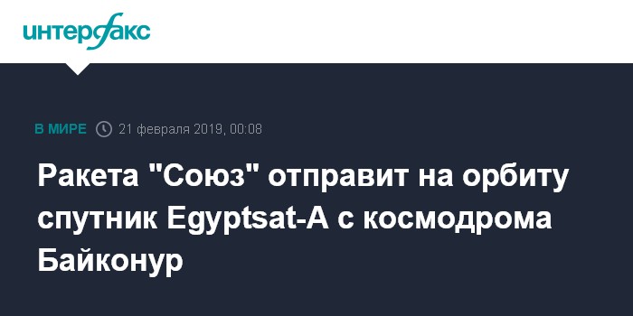 Москва. 21 февраля. INTERFAX.RU - Российская ракета "Союз-2" в четверг должна стартовать со спутником Egyptsat-A с космодрома Байконур. Как сообщала ранее ракетно-космическая корпорация (РКК) "Энергия", старт ракеты назначен на четверг в 19:47 мск.