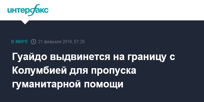 Москва. 21 февраля. INTERFAX.RU - Лидер оппозиции Венесуэлы Хуан Гуайдо, провозгласивший себя временным главой государства, планирует в четверг выехать на границу с Колумбией, чтобы лично получить и доставить гуманитарную помощь, которая поступает в приграничный колумбийский город Кукуту преимущественно из Соединенных Штатов.