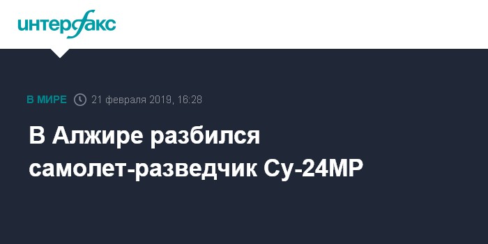 Москва. 21 февраля. INTERFAX.RU - Самолет-разведчик Су-24МР ВВС Алжира разбился накануне в провинции Тиарет при выполнении планового полета, сообщает в четверг специализированный сайт menadefense.net.