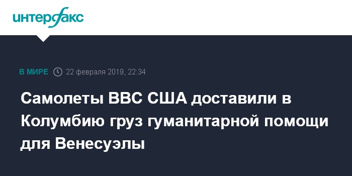 Москва. 22 февраля. INTERFAX.RU - Два военно-транспортных самолета ВВС США с 50 тоннами продовольствия и медикаментов для Венесуэлы в пятницу приземлились на аэродроме близ колумбийского города Кукуты, сообщают западные СМИ.